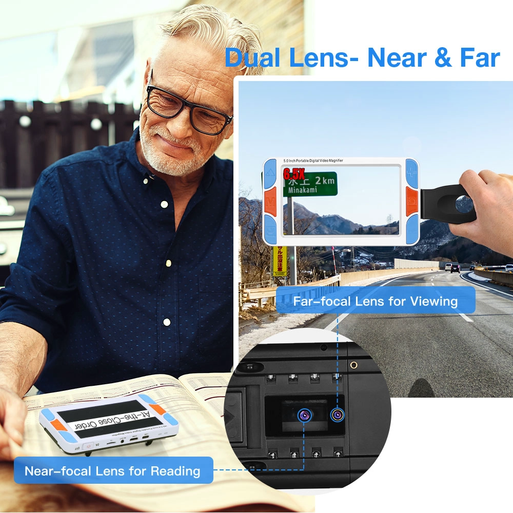 Design a doppia fotocamera: accendere il tasto di accensione, quindi premere il pulsante blu in alto a destra (tasto distanza). Se la retroilluminazione è attiva, accede alla modalità di visualizzazione ravvicinata per la lettura; Se la retroilluminazione è disattivata, entra nella modalità di visione distante per la visione distante.